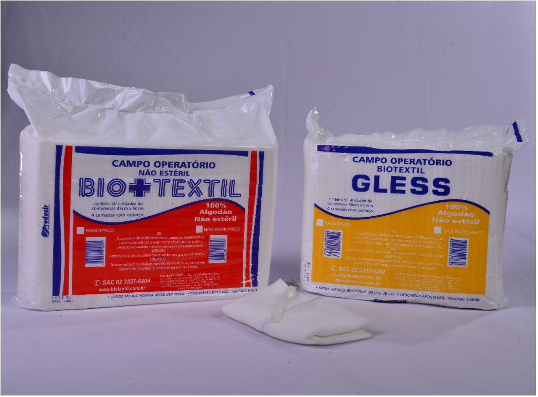 O Campo Operatório Não Estéril, é confeccionado em tecido 100 % algodão, tecido em quatro camadas, sobreposta e entrelaçadas, tipo tela, evitando assim o deslizamento entre as mesmas, com as bordas embainhadas tipo ‘’overlock’’. Possuem em uma de suas extremidades, um cadarço duplo. Seu tecido é altamente absorvente, são isentas de amido, dextrina, alvejante óptico e impurezas, são branqueadas, macias e tratadas especialmente para fins cirúrgicos.