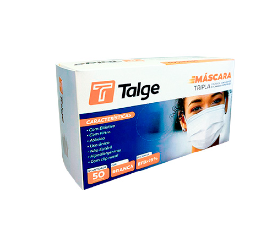 Máscaras triplas descartáveis com elástico confeccionadas inteiramente em tecido não tecido (TNT) no estilo retangular, possuem três camadas, com acabamento em toda a extremidade por soldagem eletrônica pontilhada, sendo duas camadas (externa e Bacteriana (EFB) de 95%. No centro da máscara existem três pregas que se ajustam ao aumento ou diminuição do tamanho. Quando inteiramente aberta, estas pregas protegem desde o topo do nariz até a cobertura total do queixo, cobrindo a maioria das conformações faciais conhecidas e mantendo-as protegidas.